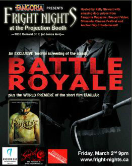 Once again I get to talk to you about the fantastic series from the Projection Booth known as Fright Nights. Kelly outdid himself this time by landing the first “official” Toronto screening of Battle Royale for this month’s outing. This happily affords me the opportunity to talk about one of my all time favorite movies. It was preceded by a world premiere of the new Fatal Pictures production Familiar. I was unfortunately running late for the screening and missed the mass of humanity socializing prior to the screening as this was a highly anticipated and heavily attended event. I did however get to sneak in while Kelly did his intro at the front of the cinema, in front of a giant Battle Royale symbol on the screen no less.