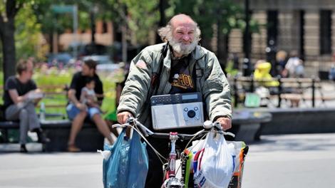 Radioman is aware of his image and tells the camera how other New Yorkers don’t know him and assume he’s homeless. He’s not, he’s a stage-three hoarder who probably makes decent money as an extra. But he sees his image as a brand and that, for example, if he doesn’t have his trademark boom box necklace or bike, his actor friends would ask him why he doesn’t have those things on certain days. He believes, and it’s probably true, that he would be a nobody if he didn’t have these things as well as keeping up the dirty homeless man appearance.