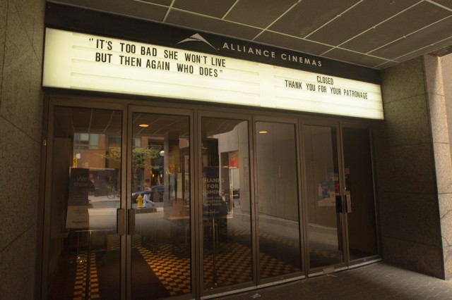 The Blade Runner quote “It’s too bad she won’t live, but then again who does” now adorns the marquee along with a thanks from the staff. Ultimately the Cumberland was victim to an over competitive marketplace in Toronto, with so many rep theaters thriving and the return of the newly renovated Bloor Cinema, the bubble had to burst on the scene at some point. I for one hope the Cumberland is it’s only victim, but fear that it won’t be the last.