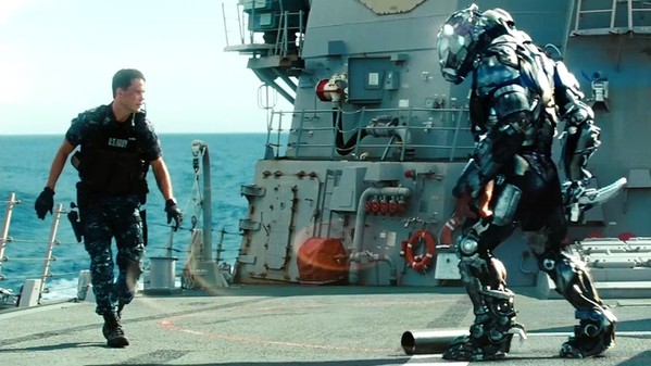Battleship starts with the brothers Hopper, Alex (Kitsch) and Stone (Skarsgard), in a bar while Stone laments the fact that Alex is a screw up who can’t stay employed. In walks Samantha Shane (Decker), whose request for a chicken burrito leads to Alex breaking into a closed convenience store for one to give her (yes, you read that right). Of course Alex is chased by the police and tased, but magically ends up waking up at home and not in a jail cell. Stone decides it’s time for Alex to join the Navy with him. We jump forward six years to find that Stone, now in his early 30’s, has become a Commander of a Naval Destroyer (!!) and Alex is now a Lieutenant and 3rd in command of another Destroyer (in only 6 years and despite his criminal past!). Sam, as it turns out is the daughter of Admiral Shane (Neeson), who doesn’t like Alex at all and may make Alex’s plans for marriage more complicated. During the setup for Rimpack, a joint Naval games exercise with Naval outfits from across the globe (so we can sell to those overseas markets!), we are introduced to many more characters, including Petty Officer Raikes (Rihanna in her theatrical debut) and a rival Japanese Captian, Nagata (Asano). During the games aliens crash-land in the ocean and construct a barrier cutting off three ships from the rest of the fleets. They proceed to destroy them with propelled charges that look exactly like the pegs from the Battleship Board Game! Of course somehow Alex becomes a commanding officer and it’s up to him to save the day.