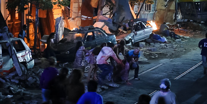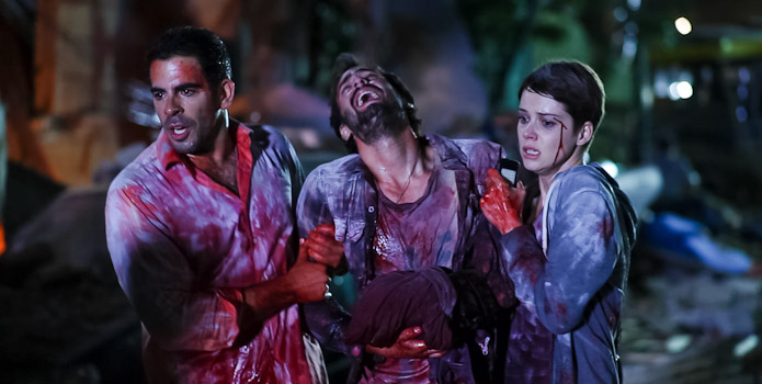 Like most disaster flicks, everybody in the story is having a fun time before their world literally falls apart. In this case, the aptly named Gringo (Roth) and his new Chilean friends Ariel (Levy) and Pollo (Martínez) pass their vacation time with drinking, parties, wine-tasting, but most importantly, keeping an eye out for beautiful, single women. The vacation gets particularly intriguing for the bachelors when they meet up with Monica (Osvart), Kylie (Izzo), and Irina (Yarovenko), three beautiful travellers also taking in gorgeous Chile. The group head off to a happening nightclub to party the night away, but just when the festivities are getting interesting a devastating earthquake rocks the country and the group of travellers are thrust into a life or death situation. Not only do they need to contend with the devastation of the initial earthquake and its numerous aftershocks, but some of the inhabitants of the once peaceful Chilean town seem to be on the brink of insanity and could also pose a danger to the group.